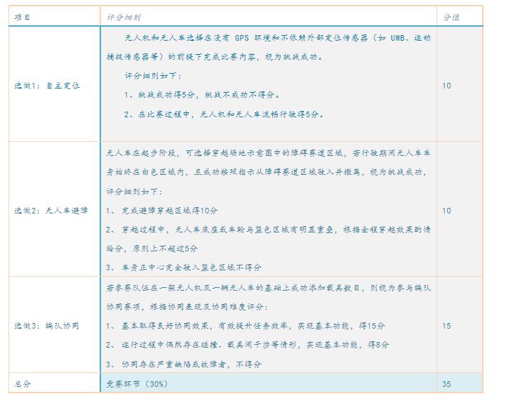 7、 现场竞赛环节的自主定位、避障赛项与编队协同赛项属于选做部分,该部分共35分,不计入总分,但若评奖时出现两支同分数的队伍,则需根据选做赛项得分定最终名次,且组委会将为选做赛项得分高的队伍单独颁发最佳创新赛事奖。