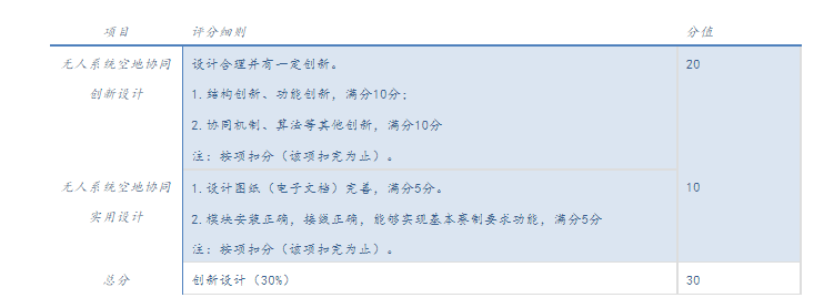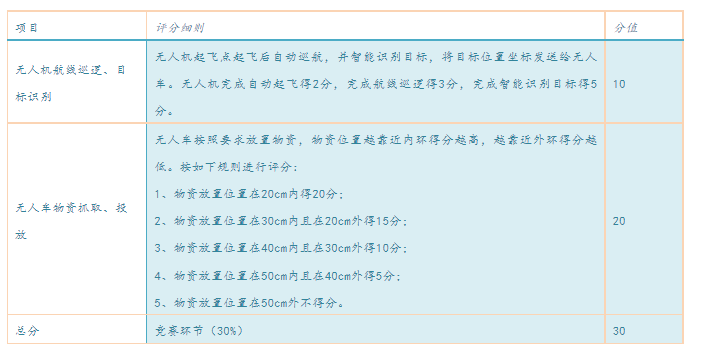 2、竞赛内容:各个参赛队伍将自主设计的无人系统进行验证演示并录制视频,展示设计的创新点和功能创新点,并用一段文字说明创新点;在4月15日前将视频、图片、说明文字等素材提交给组委会,参与公众评选,评选结果按评分规则记分。