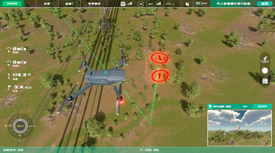 该模块根据电力行业精细化巡检标准,通过使用无人机对高压电塔进行巡检部位拍摄,以在真机实践前进行虚拟仿真培训,减少炸机风险,避免飞行时的安全事故发生,该模块具有三种模式,即新手训练、训练模式、考核模式。