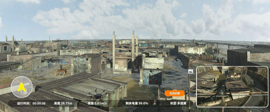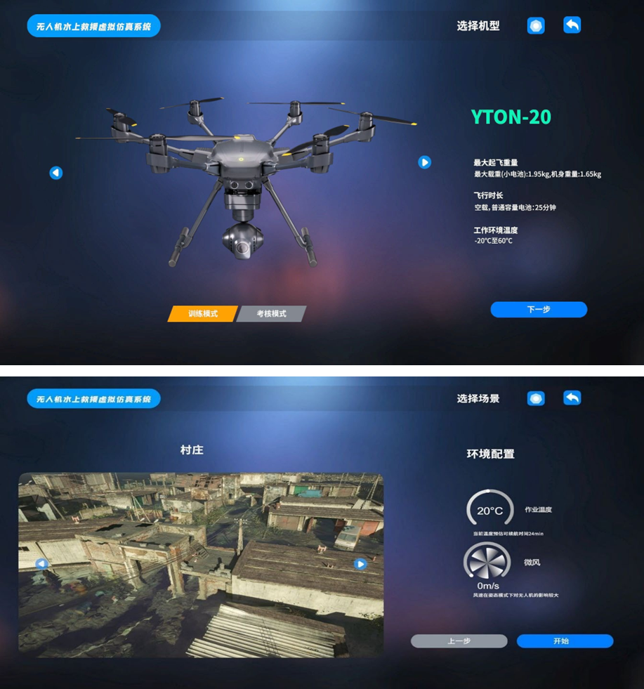 无人机凭借小巧轻便、高效安全的优势,成为水域救援强有力设备之一,通过操控无人机可将救援设备高效安全的送达指定地点以保障受灾人员的物资补给,该系统通过虚拟仿真还原受灾场景,通过使用真机遥控器操控虚拟无人机进行实战救援前的训练。